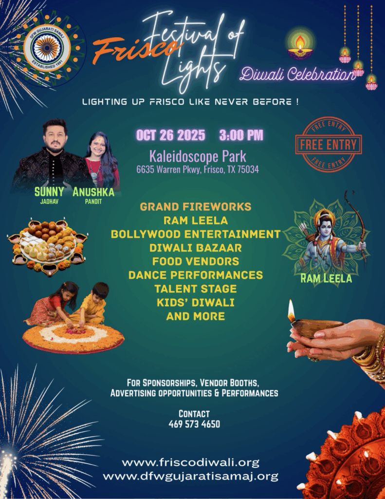 Celebrate the Festival of Lights Diwali Celebration at Kaleidoscope Park, hosted by DFW Gujarati Samaj! Enjoy a free evening filled with cultural festivities, including: