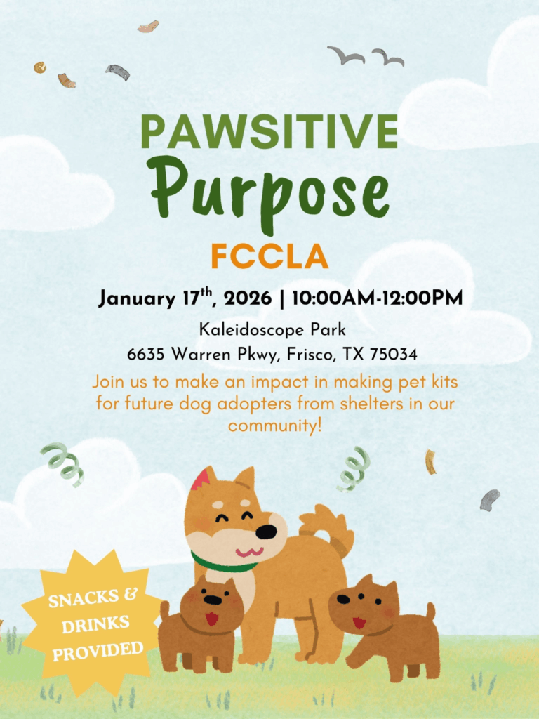 Make a pawsitive purpose with FCCLA! πΎπ Stop by Kaleidoscope Park and lend a helping hand by assembling pet kits for local animal shelters. These kits will go to future dog adopters! All materials will be provided, along with some tasty snacks and drinks. No sign-up required.